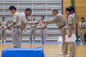 | 最後の閉会のセレモニーでは、富士章、はやぶさ章、菊章を取得したスカウトと、昨年の皆勤賞のスカウトが地区から表彰されました。八尾7団では富士章を取得したスカウトの表彰を受け、代理でベンチャー隊隊長が賞状を受け取りました。 |